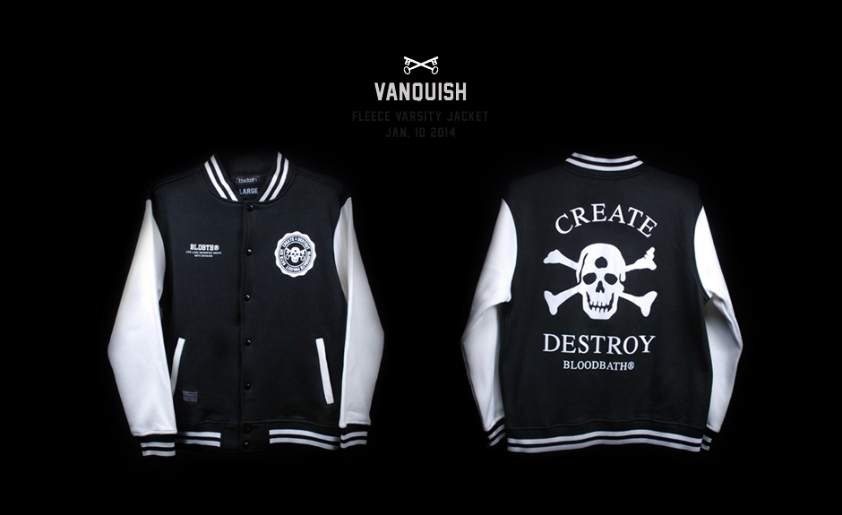 “Vanquish” Fleece Varsity Jacket is a sleek varsity silhouette with Bloodbath iconography throughout.